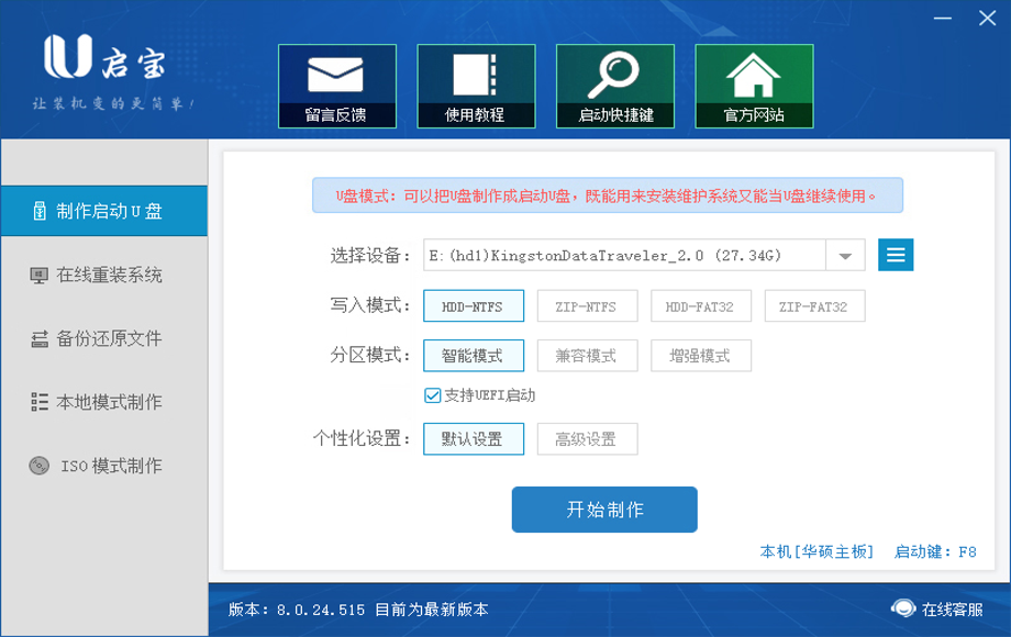 1.下载载并且运行U启宝U盘启动制作工具,插入u盘等待软件成功读取到u盘之后,点击“开始制作”。