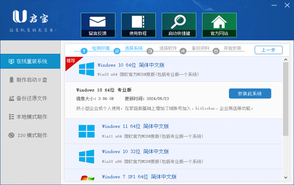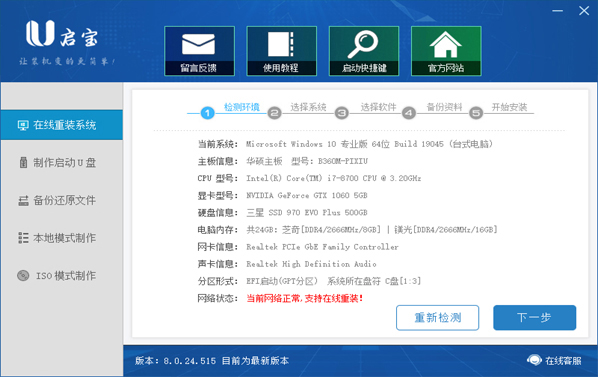 1.系统检测,下载软件完软件后正常打开("U启宝装机大师"), 程序会默认检测当前系统环境,检测完成后,点击"下一步"。